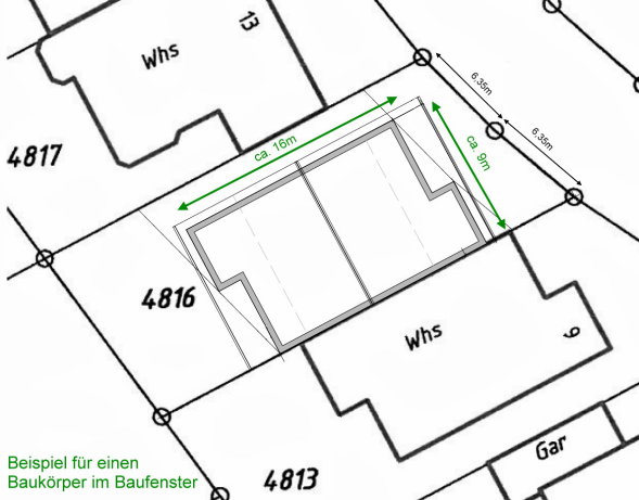 Das Grundstück ist mit einer Doppelhaushälfte zu bebauen, z.B. als EFH oder als ZFH mit einer EG-Wohnung und einer OG-DG-Wohnung (Maisonette-Wohnung).