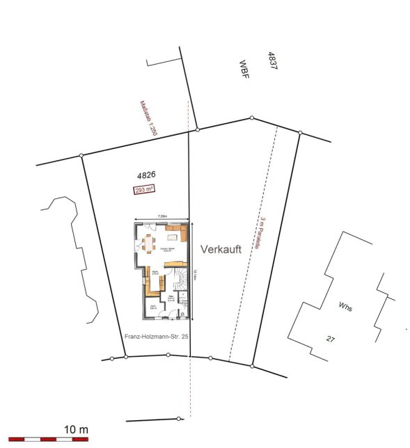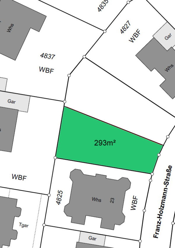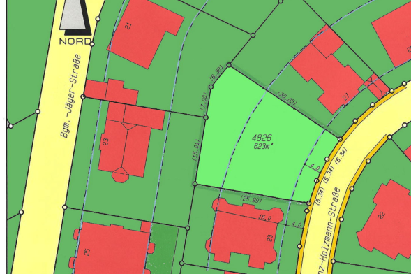 Das Grundstück sowie das Baufenster sind trapezförmig geschnitten. Ein Beispiel für eine mögliche Bebauung finden Sie ebenfalls in unserem Exposé.